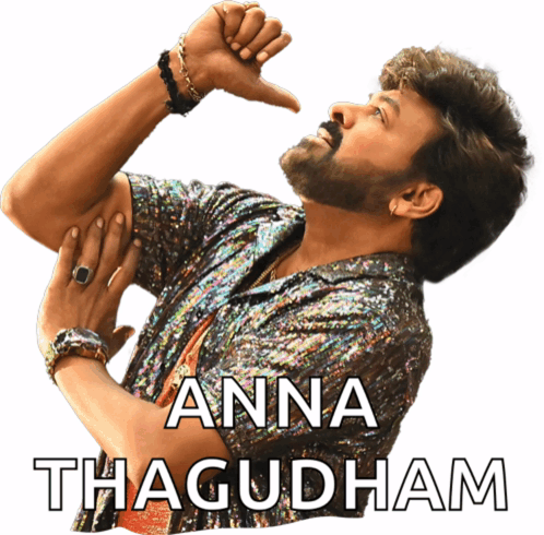 Content Description: a man with a beard is wearing a sequined shirt that says anna thagoduam