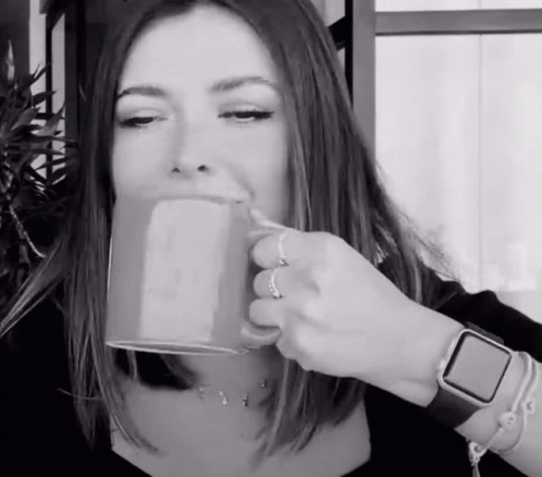 Content Description: a woman drinking a cup of coffee with a watch on