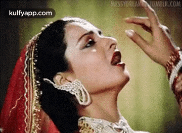 Content Description: a close up of a woman 's face with her mouth open and a veil on her head .