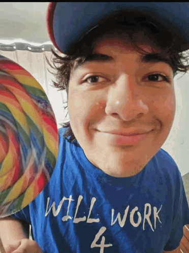 Content Description: a young man wearing a blue shirt that says will work 4 holds a lollipop
