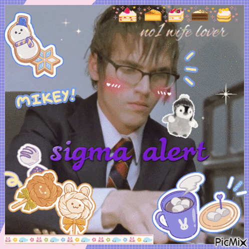 Content Description: a man in a suit and tie is surrounded by stickers and the words sigma alert on the bottom