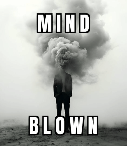 Content Description: a man in a suit with smoke coming out of his head and the words mind blown below him