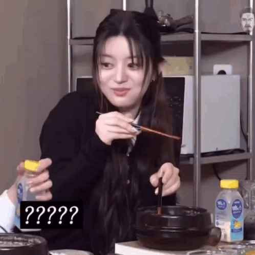 Content Description: a woman is eating food with chopsticks and a bottle of water .