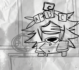 Content Description: a black and white drawing of a person with abc blocks on his head