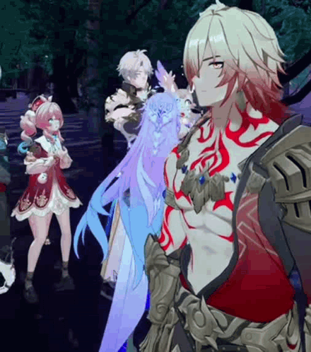 Content Description: a group of anime characters standing next to each other in a dark forest .