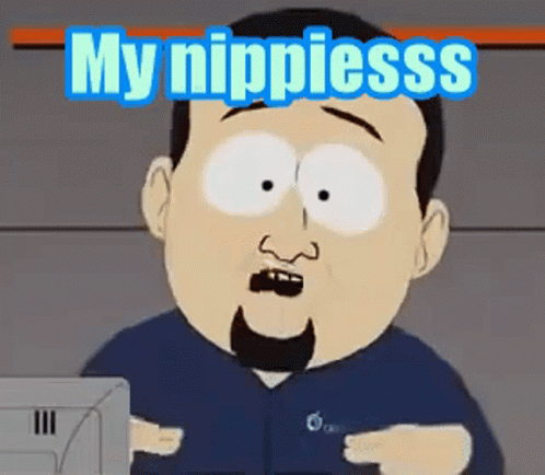 Content Description: a cartoon man with a beard is pointing at his nipples .