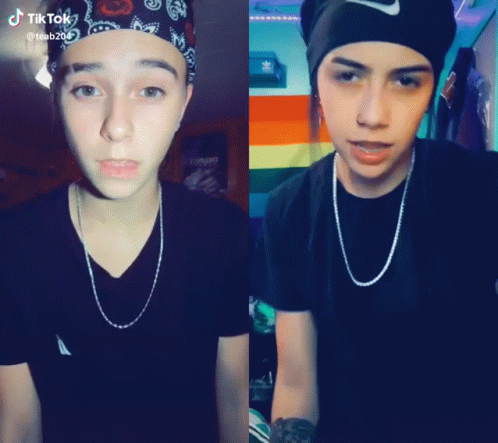 Content Description: a boy wearing a headband and a necklace is standing next to another boy wearing a black shirt .
