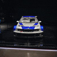 Content Description: a blue and silver sports car with a reflection of the car in the water