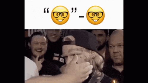 Content Description: a man wearing glasses and a hat is being congratulated by a crowd of people