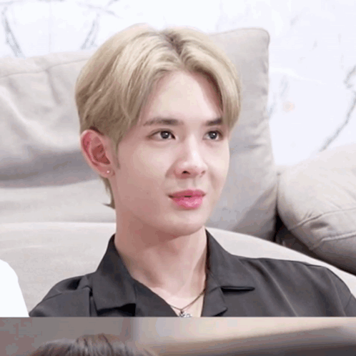 Content Description: a young man is sitting on a couch wearing a black shirt and a necklace .