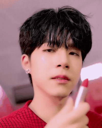 Content Description: a young man is holding a lipstick in his hand and applying it to his lips .