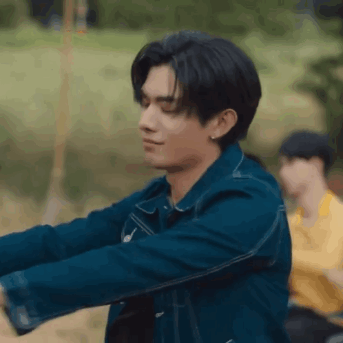 Content Description: a man in a blue jacket is stretching his arms in a park .