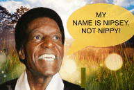 Content Description: a man with a yellow speech bubble that says my name is nipsey not nippy