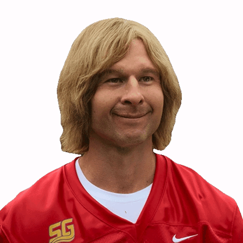Content Description: a man with blonde hair is wearing a red nike jersey with the letters sg on it