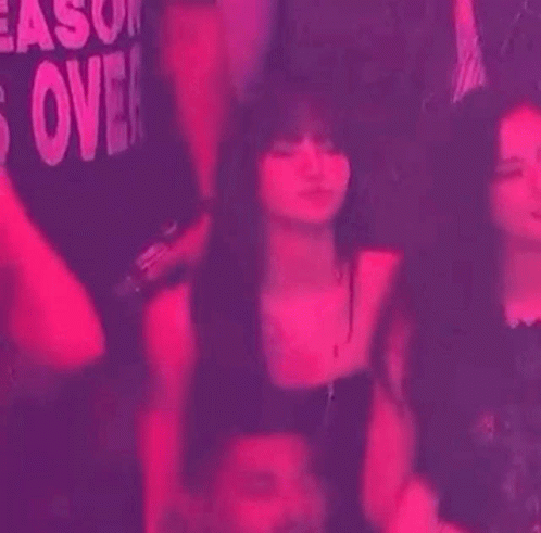 Content Description: a woman is dancing in a crowd of people at a party in a pink light .