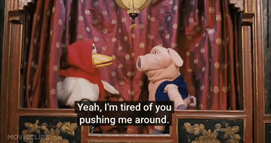 Content Description: two stuffed animals are talking to each other and one of them says yeah i 'm tired of you pushing me around