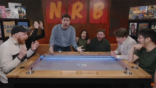 Content Description: a group of people are playing a game in front of a large nrb sign
