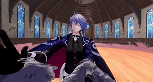 Content Description: a cartoon character in a church with stained glass windows behind him