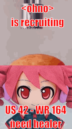 Content Description: a picture of a stuffed animal with the words ohno is recruiting us 42 wr 164 need healer on it