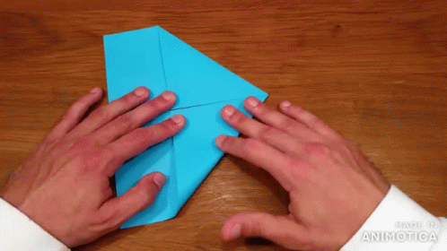 Content Description: a person 's hands folding a piece of blue paper on a wooden table .