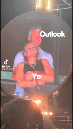 Content Description: a tiktok video of a man and woman hugging with outlook written on the bottom