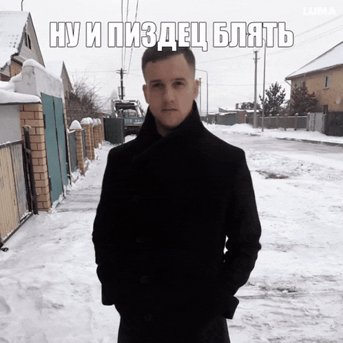 Content Description: a man in a black coat stands in a snowy street with a luma logo above him
