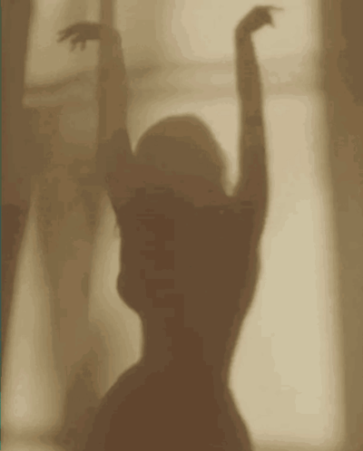 Content Description: a shadow of a woman is dancing in front of a window with her arms in the air .
