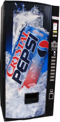 Content Description: a pepsi vending machine that says crystal pepsi