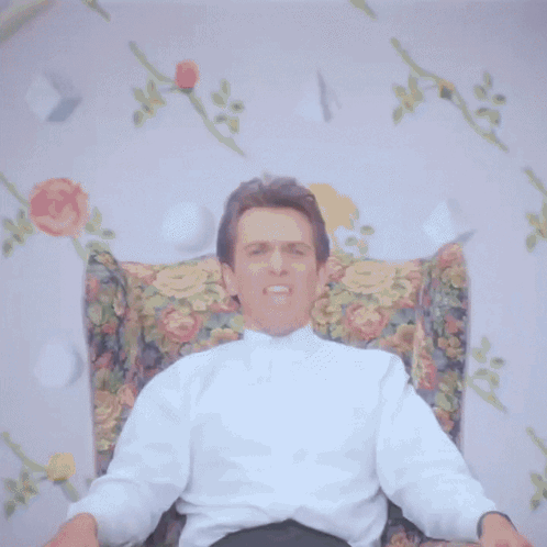 Content Description: a man in a white shirt is sitting in a floral chair making a face .