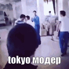 Content Description: a group of people are standing in a room with the words tokyo modep written on the bottom of the image .