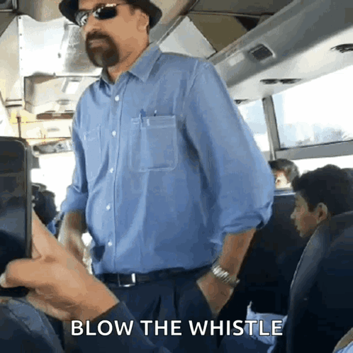 Content Description: a man blowing a whistle on a bus while someone takes a picture