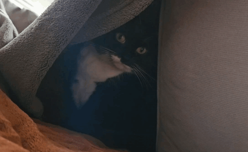 Content Description: a black cat is laying under a blanket and looking at the camera