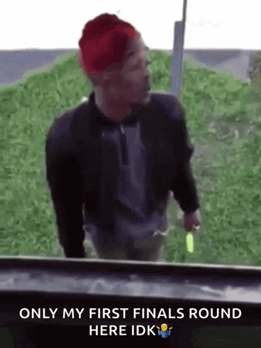 Content Description: a man wearing a red hat and a black jacket is standing in front of a grassy hill .