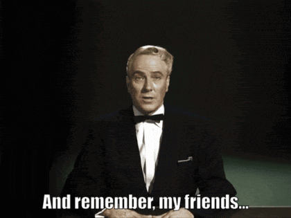 Content Description: a man in a tuxedo and bow tie says " and remember my friends "