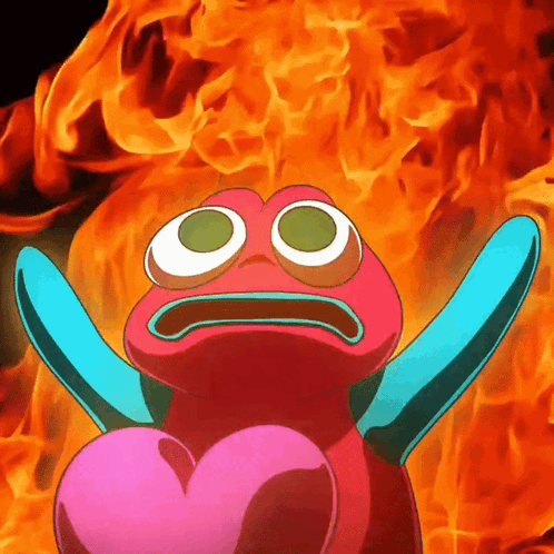 Content Description: a cartoon character holding a pink heart in front of a fire