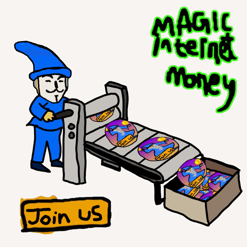 Content Description: a cartoon of a man standing next to a conveyor belt that says " join us "