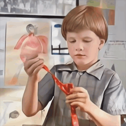 Content Description: a young boy is tying a red tie in front of a painting of a man