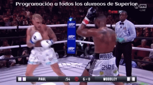 Content Description: a boxing match between paul and woodley is being shown on the screen