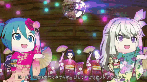 Content Description: a group of anime girls are dancing in front of a disco ball in a room