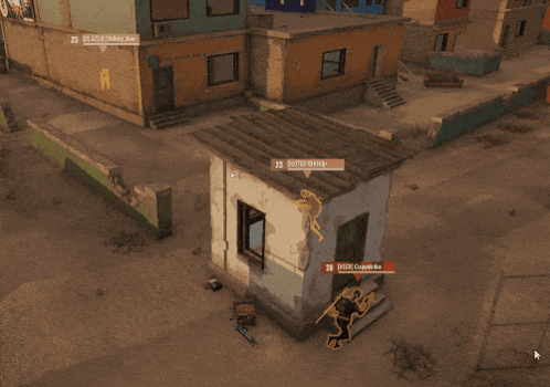 Content Description: a screenshot of a video game shows a few buildings and a shack with the number 22 on it