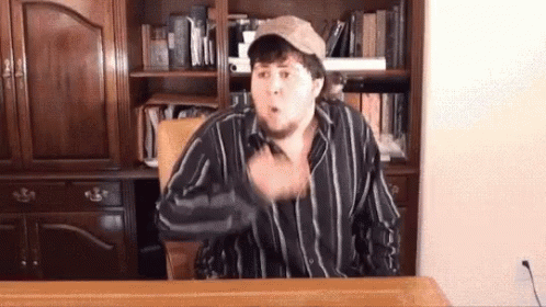 Content Description: a man wearing a hat and a striped shirt is sitting at a desk in front of a bookshelf .