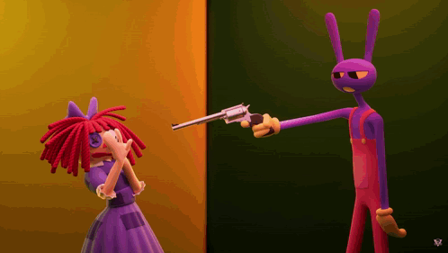 Content Description: a purple rabbit is pointing a gun at a pink doll