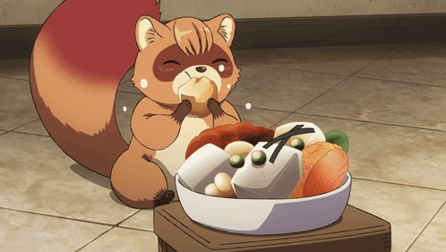 Content Description: a cartoon squirrel is eating food from a bowl with a letter k on it