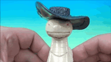Content Description: a toy snake wearing a cowboy hat is being held in someone 's hands .
