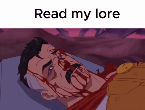 Content Description: a cartoon of a man with blood on his face and the words read my lore on the bottom