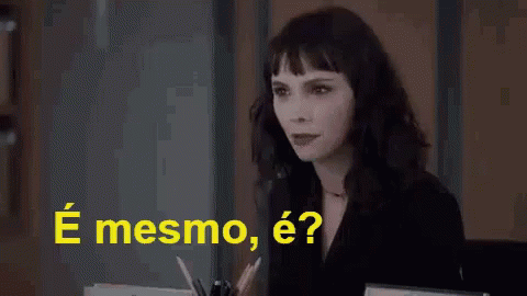 Content Description: a woman sitting at a desk with the words " e mesmo e " written in yellow