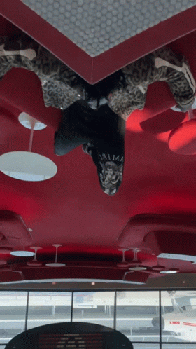 Content Description: a person wearing a black shirt with the word palma on it is upside down