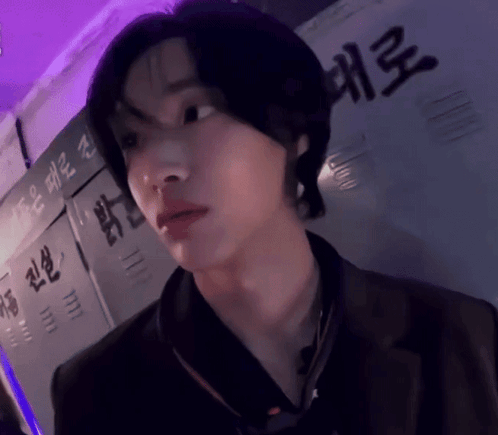 Content Description: a close up of a person 's face in front of a purple wall with chinese writing on it