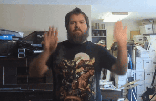 Content Description: a man with a beard is wearing a black t-shirt with a picture of a monkey on it