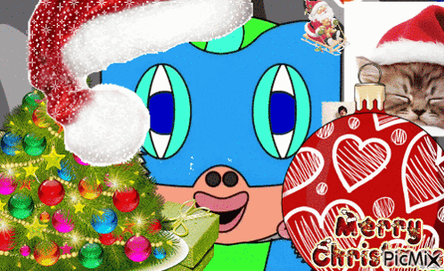 Content Description: a picture of a christmas tree and a cat with the words merry chris picmix on the bottom